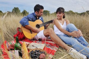 happy couple enjoying countryside picnic in long grass
