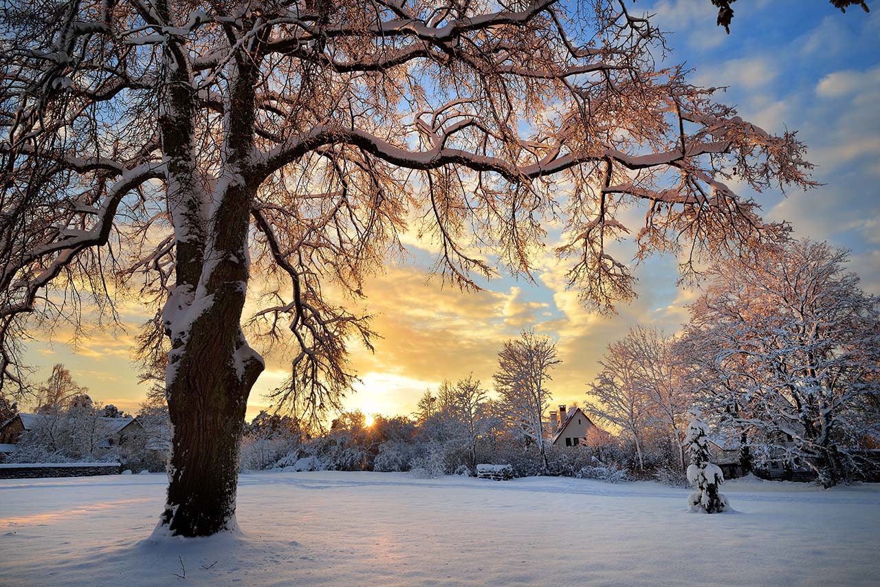Snow covered winter countryside at the sunset in Latvia